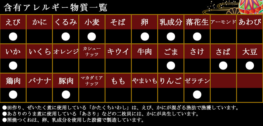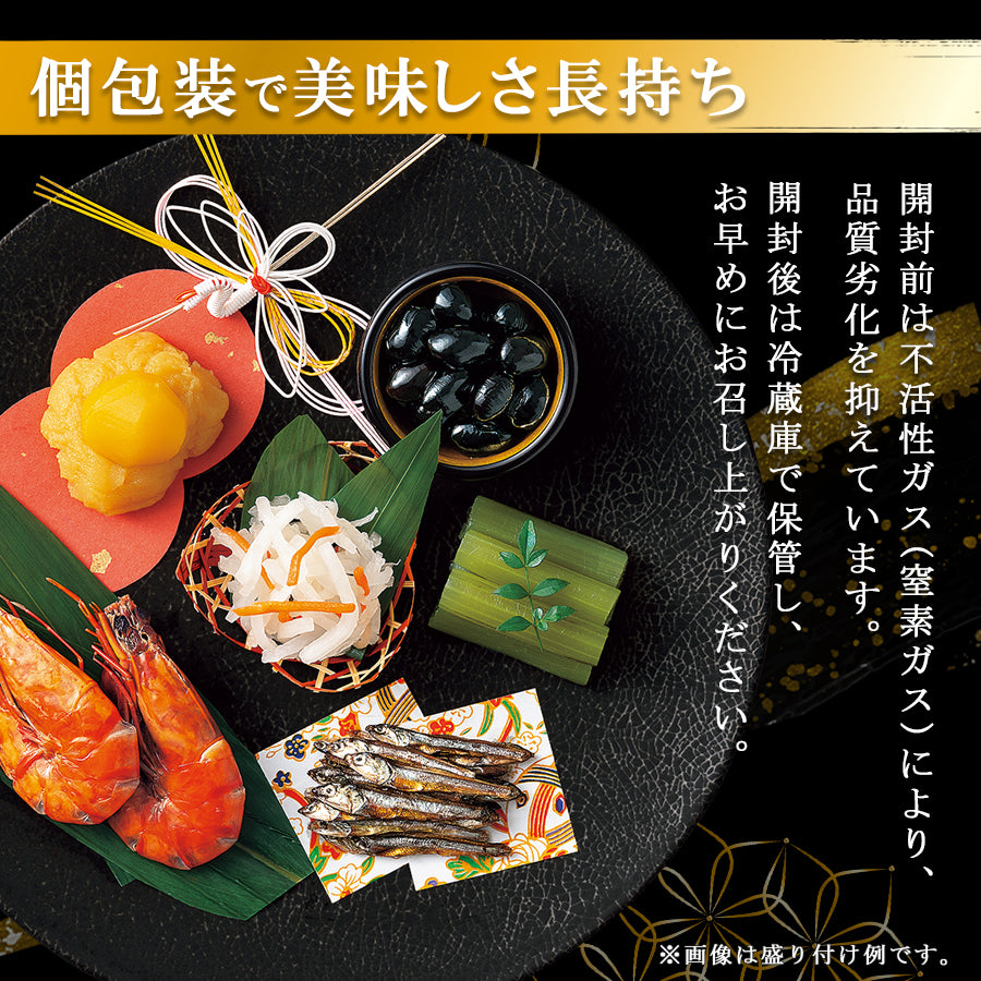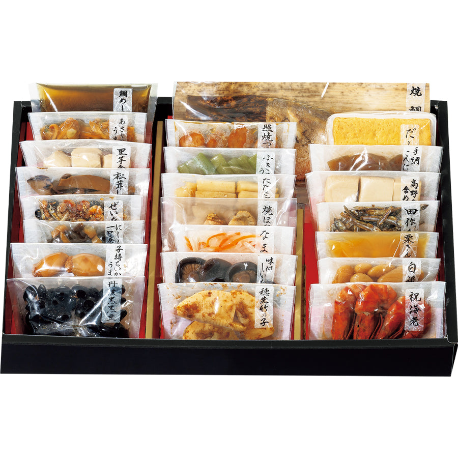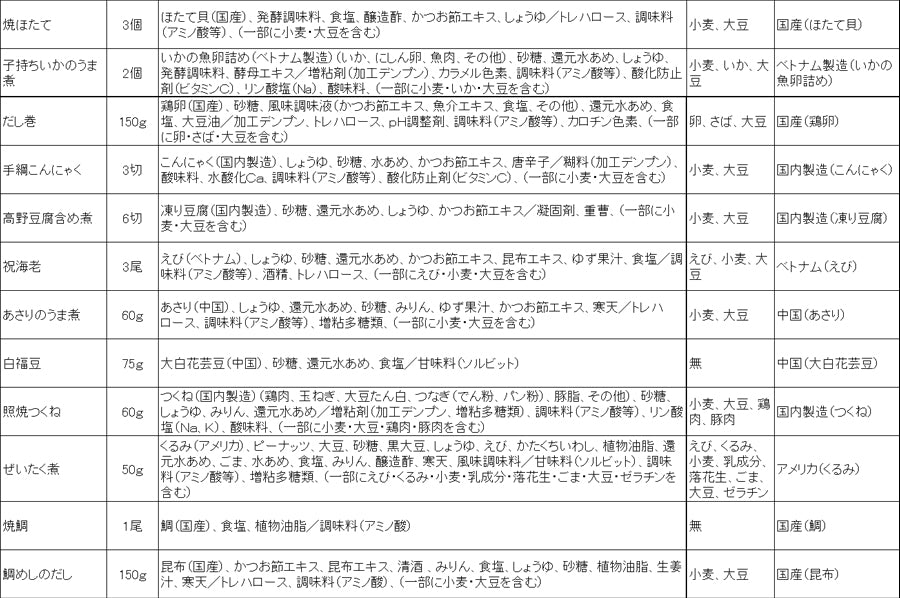 田作り、丹波黒黒豆、ふきのうま煮、里芋含め煮、たたきごぼう、にしん一口巻昆布、松茸しぐれ、栗きんとん、味付しいたけ、穂先竹の子、なます、焼ほたて、子持ちいかのうま煮、鯛めしセット(焼鯛・鯛めしのだし)、だし巻、手綱こんにゃく、高野豆腐含め煮、祝海老、あさりのうま煮、白福豆、照焼つくね、ぜいたく煮※原料事情等により、お断りなく内容の一部が変更となる場合がございます。※鯛めしセットに米はついておりません。