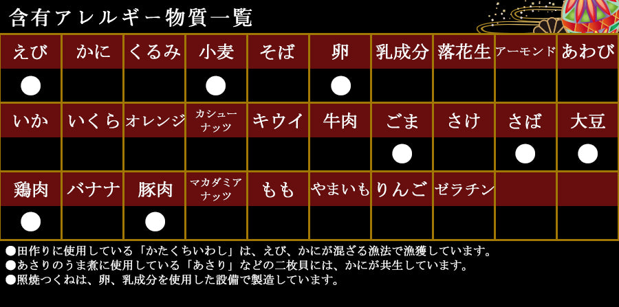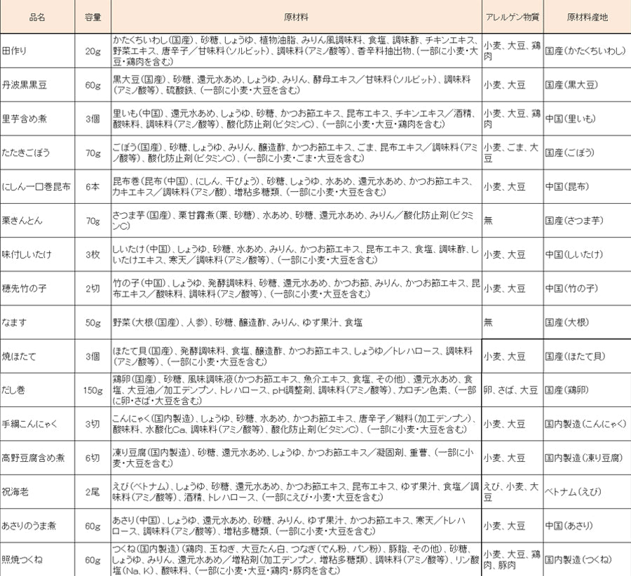 田作り、丹波黒黒豆、里芋含め煮、たたきごぼう、にしん一口巻昆布、栗きんとん、味付しいたけ、穂先竹の子、なます、焼ほたて、だし巻、手綱こんにゃく、高野豆腐含め煮、祝海老、あさりのうま煮、照焼つくね※原料事情等により、お断りなく内容の一部が変更となる場合がございます。