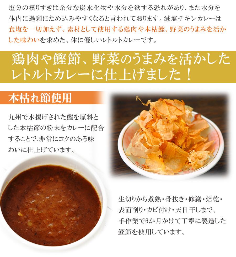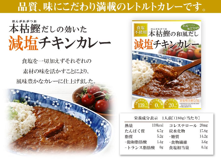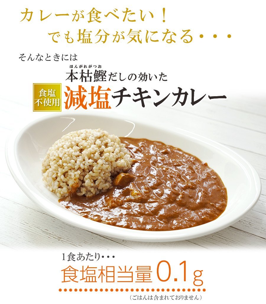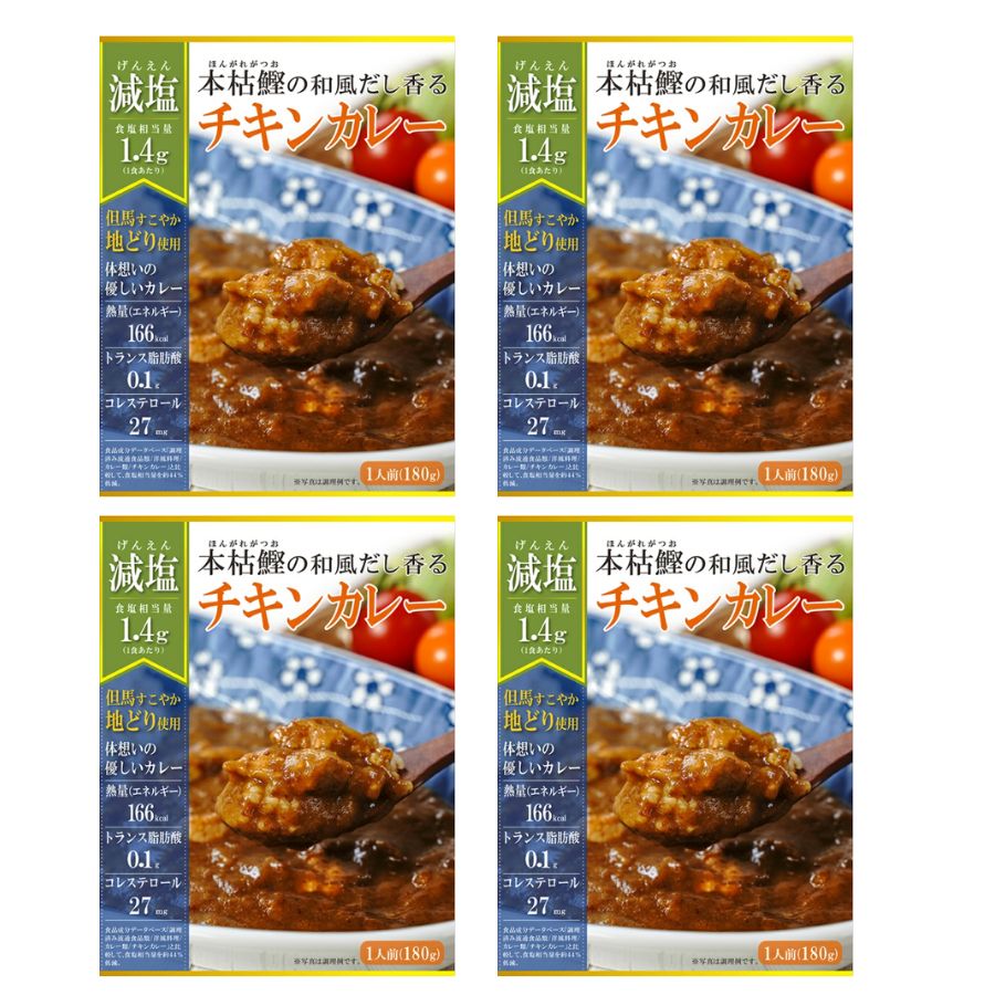 | セット内容 | ●食塩不使用 本枯鰹だしの効いた 減塩チキンカレー 180g×4個 詳細はこちら |