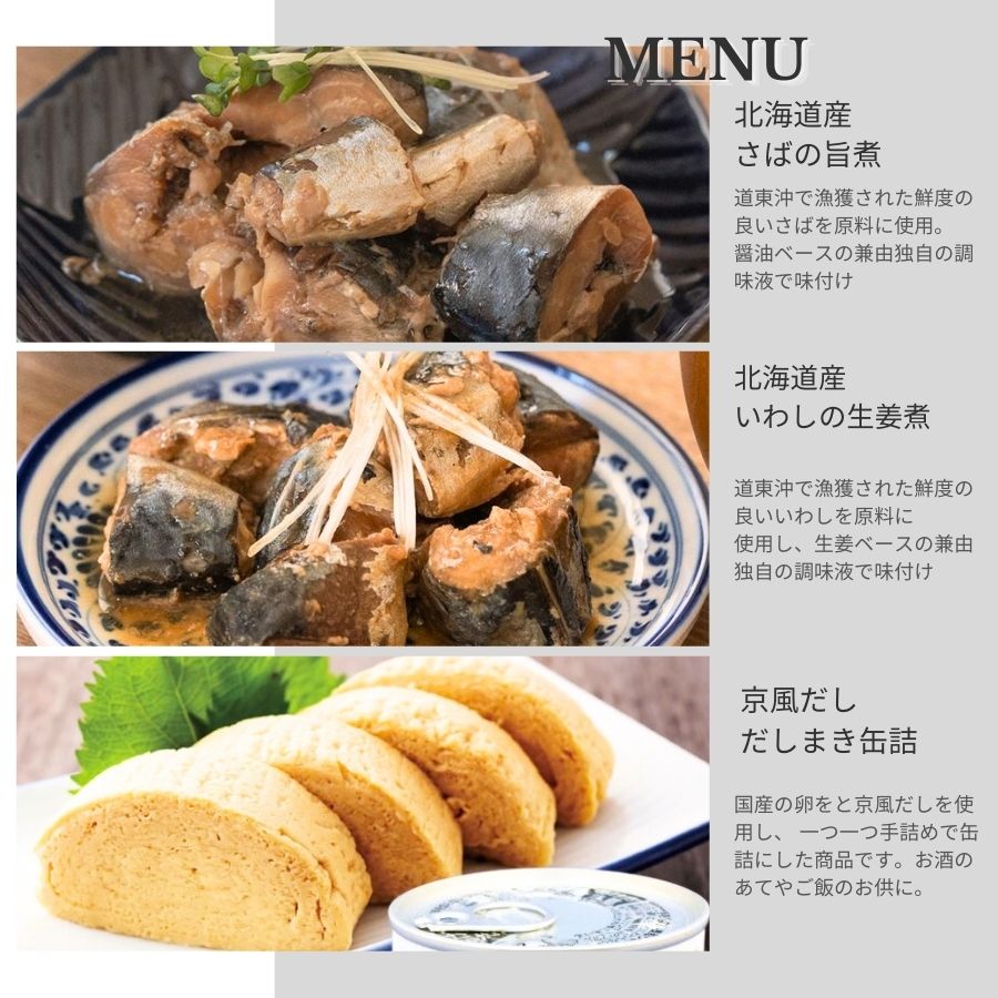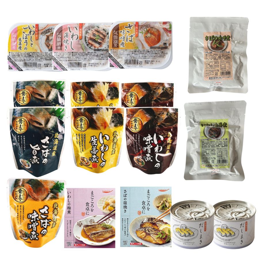 | セット内容 | ●北海道産 いわしの生姜煮 95g ×2個 ●北海道産 いわしの味噌煮 95g ×2個 ●北海道産 さばの旨煮 120g ×2個 ●北海道産 さばの味噌煮 120g ×1個 ●いわし生姜煮 150g ×1個 ●いわしの梅煮 2尾 ×1個 ●さばの味噌煮 120g ×1個 ●さばの塩焼き 2切れ ×1個 ●国産さばの味噌煮 120g ×1個 ●国産いわしとごぼうの生姜煮 120g ×1個 ●国産いわし蒲焼き 120g ×1個 ●京風だし だしまき缶詰 190g×2個 |