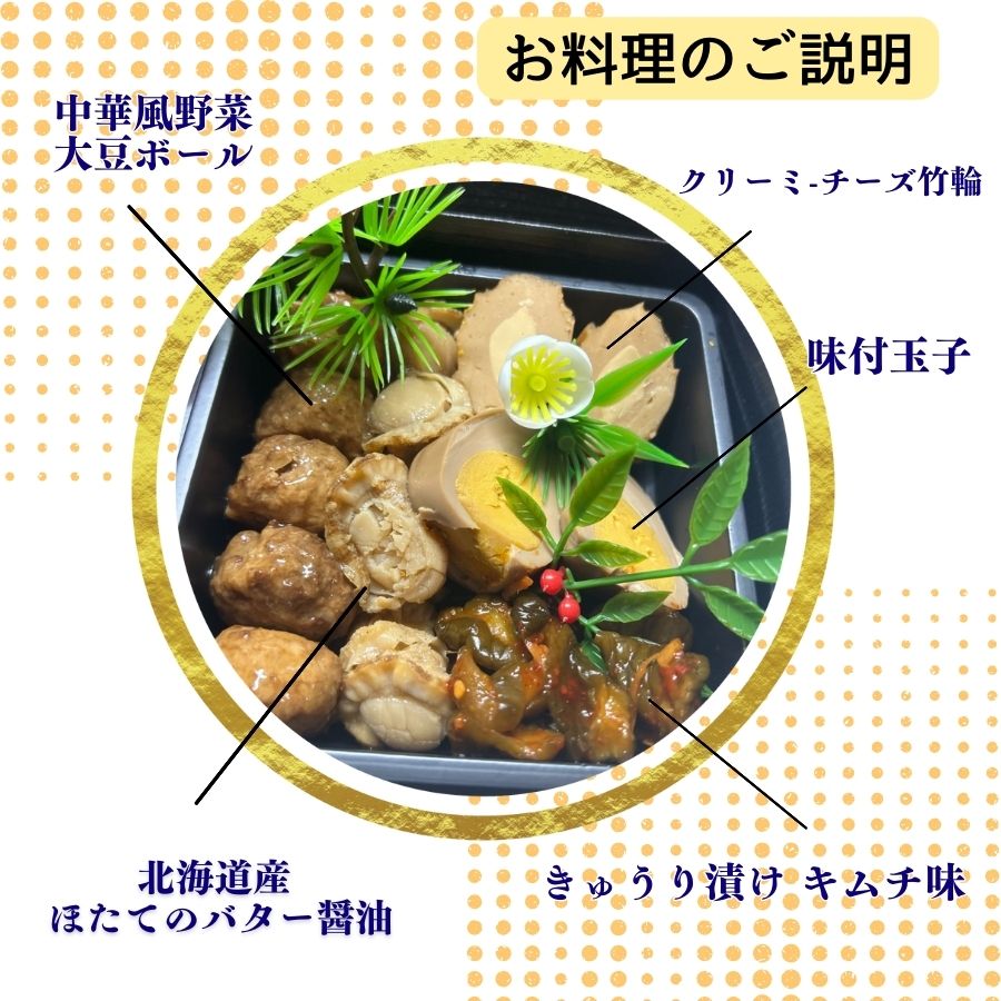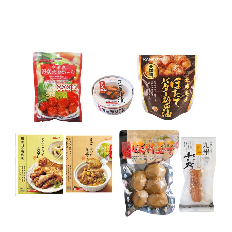 | セット内容 | ●北海道産 ほたてのバター醤油 65g ●ひよこ豆入りタンドリーチキン70g ●鶏手羽の黒酢煮165g ●中華風野菜大豆ボール 100g ●きゅうり漬け キムチ味 缶詰め60g ●クリーミ-チーズ竹輪2本 ●味付玉子5個入り |